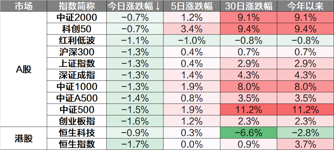 今日市场震荡下挫。核心宽基指数悉数下跌,仅微盘股上涨,创业板50、创成长领跌。