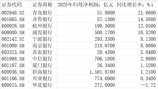 截至2026年2月12日,已有12家上市银行公布了2025年业绩快报,除华夏银行,其他各家净利润均实现正增长:青岛银行的归母净利润同比增幅超过20%,齐鲁银行、杭州银行、浦发银行的归母净利润增幅同比也在10%以上。而华夏银行归母净利润则比2024年末下降1.72%。