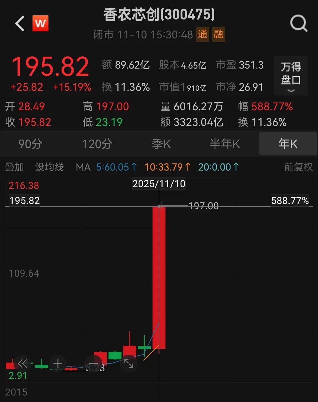 盘面上,香农芯创今日收盘涨15.19%,最新市值达910亿元。该股年内股价累计暴涨超588%,成为本轮存储芯片行情中最耀眼的明星。