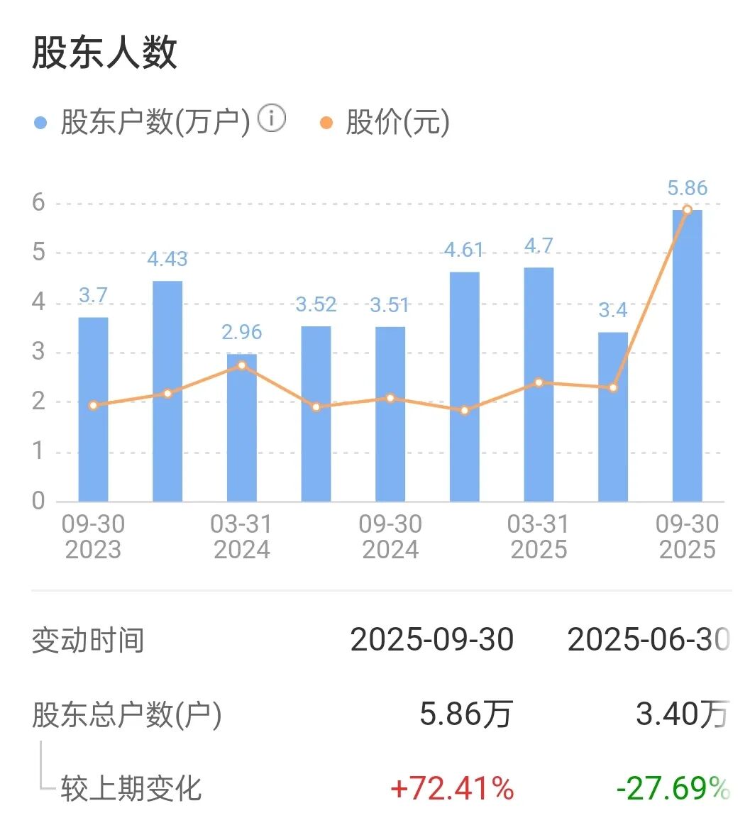 此外,公司股东数伴随股价大幅上涨,公司股份筹码分布趋于分散。二季度末股东数为3.4万,到三季度末增长至5.86万户。